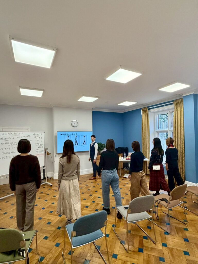 立ち方の基礎、靴の選び方などを、ちょっとした実技も含め